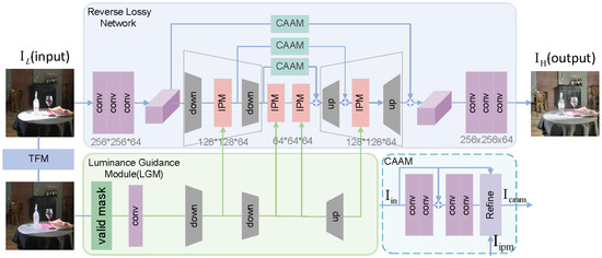 The effectiveness of the UNet-like encoder–decoder architecture in reconstructing HDR images has been demonstrated by many algorithms [23,38,44]. This architecture can effectively use hierarchical multiscale information from low-level to high-level features. Therefore, based on the LDR–HDR framework, the UNet-like network architecture is chosen as the backbone for the Reverse Lossy Network design. The network framework is shown in Figure 4.