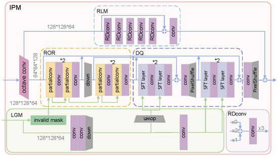 where ⊙ represents a channel-wise multiply. The SFT layer utilizes to adaptively modulate the layer based on the value of the valid mask. Before each convolution, the SFT layer is used to modulate spatial information, which is then combined with the residual features of the ROR module to guide the subsequent convolution operations. Finally, the feature through the ROR module and DQ module, and the feature through the RLM module are integrated using the following formula:
