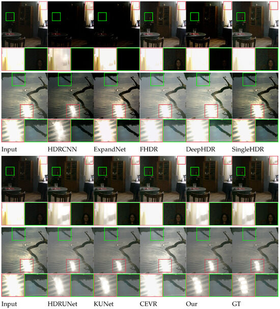 To evaluate the performance of the proposed RLUNet, comparisons are made with eight existing state-of-the-art methods for learning-based single-image HDR reconstruction: HDRCNN [38], ExpandNet [42], FHDR [41], DeepHDR [39], SingleHDR [36], HDRUNet [23], KUNet [44], and CEVR [34]. Most of these methods utilize different datasets that are not publicly available, and these datasets involve special operations on the data to be processed. However, HDRUNet [23] and KUNet [44] use the same training dataset as the proposed RLUNet method. The images in the NTIRE testset were randomly cropped to a size of 1024 × 1024, considering that some methods can only test images with a resolution that is a multiple of 32. The images in the datasets are stored with gamma correction and are nonlinear. Before the quantitative evaluation, the test results in the experiments are uniformly gamma-corrected.