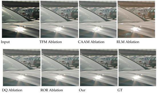 where represents the CAAM block’s output features, represents the IPM block’s output features, and represents the final reconstructed HDR features. The function denotes the fusion operation of two features. In comparison to more complex fusion methods, such as splicing or multiplication, the pixel-by-pixel addition operation not only exhibits a low computational complexity but also effectively stabilizes the gradient propagation process.