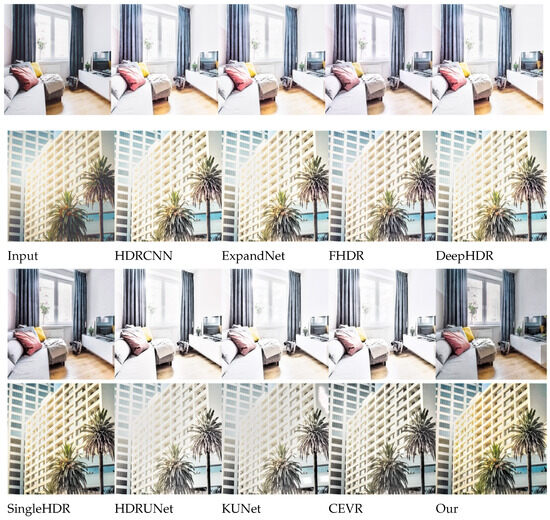 To evaluate the reconstruction performance of various models in real-world scenes, we curated an LDR dataset. The dataset comprises LDR images [70,71,72,73] from online platforms (Getty Images, Unsplash, iStockPhoto, and Jason Naltman) and images taken by the authors. In the realistic scene depicted in Figure 10, the results generated by existing methods are very poor in terms of brightness saturation and color consistency, as perceived by the human eye. HDRUNet and KUNet exhibit excessive brightness saturation in the living room and floor scenes, with colors appearing overly whitened. Moreover, for the detail restoration of overexposed areas, the detail information generated by some methods shows obvious content distortions, such as DeepHDR and CEVR, which have almost no effect on repairing the information of the trees outside the window. SingleHDR can repair the overall contour information of the overexposed area but still suffers from content loss in detail restoration. In contrast, our method performs well in maintaining the consistency of brightness and color (e.g., the brightness of the living room and the color of the objects) and in restoring the details of overexposed areas (e.g., the trees outside the window in the figure). The TFM block, which provides luminance details to the ROR module, enhances the restoration of overexposed areas, resulting in sharper contours and richer details in our results. Additionally, by reconstructing the linearized mapping, the RLUNet model generates results that are closer to the human eye’s visual perception of real-scene tones.