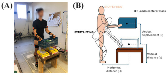 A representative subject who performed the lifting task (A) and a graphical representation of the task and experimental setup (B).