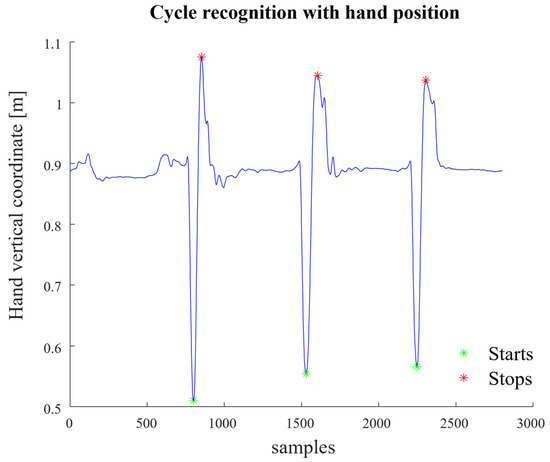 Each lifting cycle was identified by determining a ‘start’ and a ‘stop’ instant. These time frames were identified using the vertical position of the hands: the ‘start’ and ‘stop’ instants correspond to the minimum and maximum values of the vertical coordinates, respectively, [18] as shown in Figure 2. Since the motion is symmetrical, the identification was carried out only in the right-hand position.