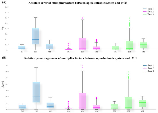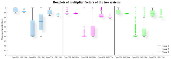 To further investigate the differences between the multipliers’ values from the two systems, Figure 4 depicts the boxplots of the and values of each multiplier computed by the optoelectronic and IMU systems for each task. For each task and multiplier (DM, HM, VM), the line in the box is the median value, the upper and lower limits of the box are the 25th and 75th percentiles, and the circles are outliers.