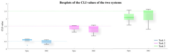 Figure 5 reports the resulting CLI values for the three tasks of the ten subjects calculated from the optoelectronic and IMU data as boxplots. In detail, the dotted lines refer to the theoretical values of the tasks, the line in the box is the median value, the upper and lower limits of the box are the 25th and 75th percentiles, and the circles are outliers. The repeated measures analysis of variance (rANOVA) did not show any statistically significant difference between the IMU and the optoelectronic system (F = 0.278 and p-value = 0.611).