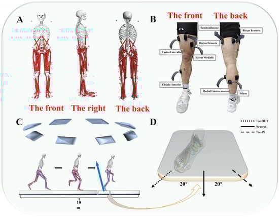 Overview of the musculoskeletal modeling process and determination of foot forward angle during cutting maneuver. (A) Illustration of the placement of the 38 valid marker points in the constructed musculoskeletal model. (B) Schematic of lower extremity surface EMG test locations. (C) Schematic diagram of biomechanical testing of the side-cutting process. (D) Schematic representation of different angles of foot progression angle at initial contact.