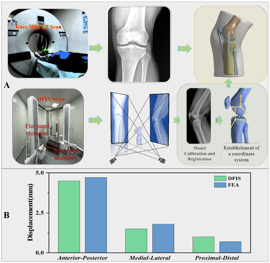 (A) The CT and MRI scanning techniques were used to acquire knee data and create a finite element model of the knee, including the construction of muscles, bones, and ligaments; and the DFIS technique was used to acquire and process the fluoroscopic image data of the knee, and to align the projected contours and calibrated coordinate system with the actual X-ray bone position. (B) Illustration of the results of a validated FEM of knee displacement obtained based on the DFIS system.