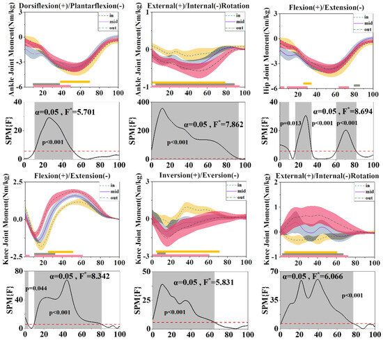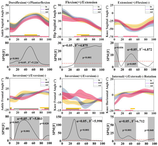 Detailed results of joint angles and peak moments for different initial contact foot progression angles (20°, 0°, and −20°) at foot strike. The results of SPM analysis for TI, TN, and TO conditions are shown. The yellow, blue, and red areas correspond to the results of the SPM analysis for TI vs. TN, TN vs. TO, and TI vs. TO. F* is a specific threshold to distinguish between significant and non-significant regions. Note: in: toe-in; mid: toe-neutral; and out: toe-out.