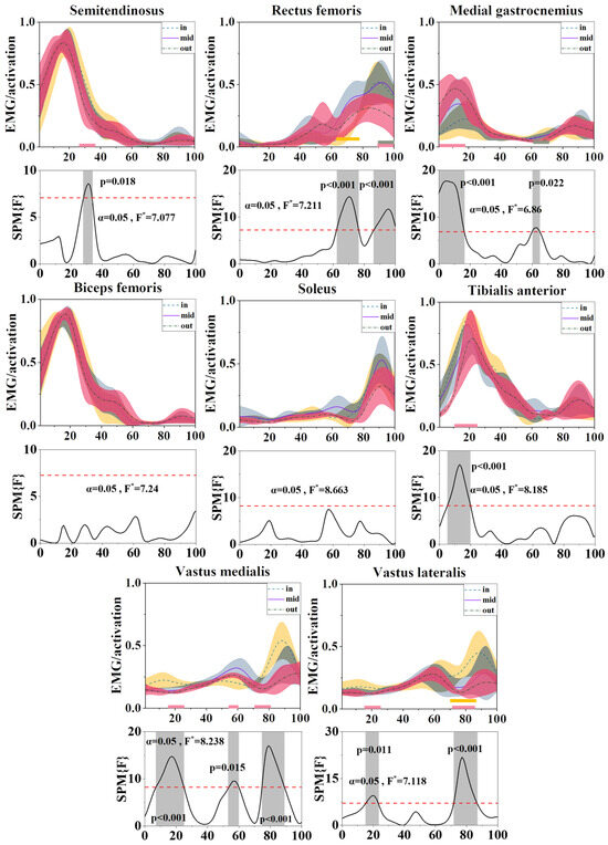 The muscle activation of the semitendinosus, rectus femoris, medial gastrocnemius, vastus medialis, vastus lateralis, and tibialis anterior showed significant differences with the gradual increase in the foot external rotation angle at touchdown. The results of the statistical parametric mapping (SPM) analysis are shown in Figure 6. In terms of semitendinosus activation, post hoc analyses showed that, during the stance phase (26–37%, p = 0.018), there were no significant differences between the TI and the TN and between the TN and the TO condition, and only a significant difference between the TI and the TO condition. The results showed that the activation of the medial gastrocnemius increased with the increasing foot external rotation angle during the initial phase of the stance (0–18%, p < 0.018). The same was true for the tibialis anterior muscle. In contrast, the activation of vastus medialis and vastus lateralis decreased with the increasing foot external rotation angle.