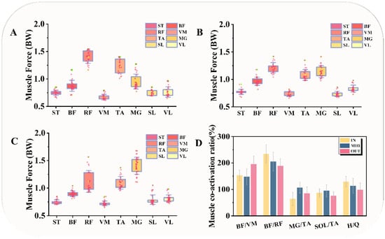 Description of lower extremity muscle force and muscle co-activation results for three different side-cutting tasks. (A) Results of toe-in muscle force. (B) Results of toe-neutral muscle force (C) Results of toe-out muscle force (note: VM, vastus medialis; BF, biceps femoris; TA, tibialis anterior; SOL, soleus; MG, medial gastrocnemius; RF, rectus femoris). (D) Results of muscle co-activation (note: H/Q, hamstrings-to-quadriceps).
