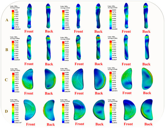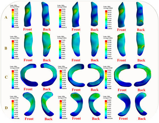 Visualization of von Mises stress distribution for three different lateral cutting tasks (from left to right: toe-neutral, toe-medial, and toe-out). (A) Results of ACL stress. (B) Results of posterior cruciate ligament stress. (C) Results of lateral meniscus stress. (D) Results of medial meniscus stress.