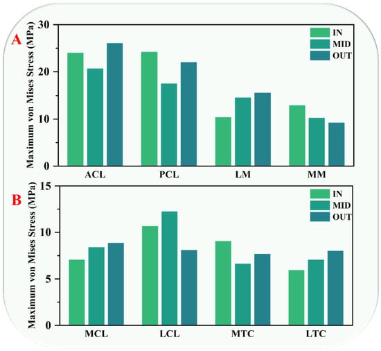 During cutting maneuvers, the maximum stresses in each ligament and cartilage (Figure 10) at the initial touchdown positions of the foot in internal rotation, neutral, and external rotation were as follows: the maximum stresses in the medial collateral ligament were 7.052 MPa, 8.3994 MPa, and 8.8569 MPa; the maximum stresses in the lateral collateral ligament were 10.658 MPa, 12.225 MPa, and 8.073 MPa; the maximum stress in the medial tibial cartilage was 9.0452 MPa, 6.6304 MPa, and 7.6644 MPa; and the maximum stress in the lateral tibial cartilage was 5.9317 MPa, 7.0499 MPa, and 7.9956 MPa, respectively (Figure 10A–D and Figure 9B).