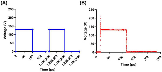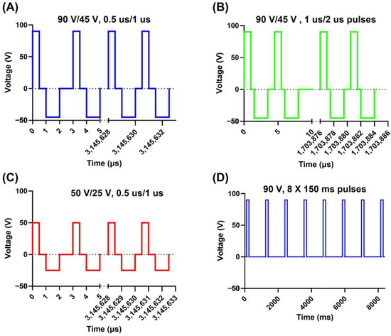 A 1 cm2 square monopolar platinum electrode designed for a more uniform electric field and increased gene delivery aligned with the grounding plate was placed in direct contact with the rat’s skeletal muscle, and specific pulsing conditions were applied [18]. These liveGT conditions included asymmetric biphasic pulses, as well as monophasic pulses, as can be seen in Figure 2. The first group received 32 trains of 32,367 pulses at 90 V/45 V with alternating 0.5 µs/1 µs pulse lengths (Figure 2C). The second group received 8 trains of 32,367 pulses at 90 V/45 V with 1 µs/2 µs pulse lengths (Figure 2B). The third group—identical to the first group in pulse length, number of pulses, and number of train pulses—was administered at an applied voltage of 50 V/25 V (Figure 2A). Additionally, a monophasic condition was applied, consisting of square wave pulses with 8 pulses of 150 ms each at an applied voltage of 90 V (Figure 2D). This pulsing parameter was sourced from previous work yielding high myocardial gene expression [19]. All experimental conditions were compared against injection-only sites that received pDNA and did not undergo pulsing. Following completion of pulsing or injection, the incisions were closed.