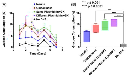 Monophasic GET co-delivery of insulin and glucokinase significantly increases cellular glucose consumption. Glucose consumption over six days compared to glucose metabolism in controls (A). The highest levels of media glucose depletion are seen on day three (B). ***: p ≤ 0.001; ****: p ≤ 0.0001.