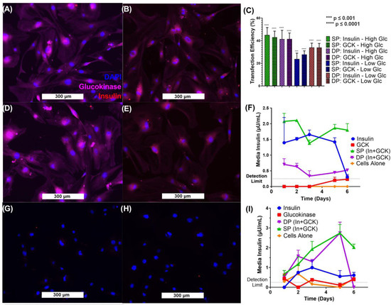 Protein expression levels were determined via immunofluorescence microscopy for both high-glucose (Figure 5A,D,G) and low-glucose (Figure 5B,E,H) conditions. Enhanced transfection efficiency was evident in groups subjected to pulsing compared to myoblasts receiving DNA alone (Figure 5C). Notably, no significant disparities were observed in transfection efficiency between low- and high-glucose media; however, slightly reduced protein expression was measured in the low-glucose media (Figure 5C). Detection of human insulin in the media was consistent across all groups transfected with DNA encoding insulin under both high-glucose (Figure 5F) and low-glucose (Figure 5I) conditions. Myoblasts that did not receive pDNA encoding insulin exhibited human insulin levels below the detection limit of the human insulin ELISA (Figure 5F,I).