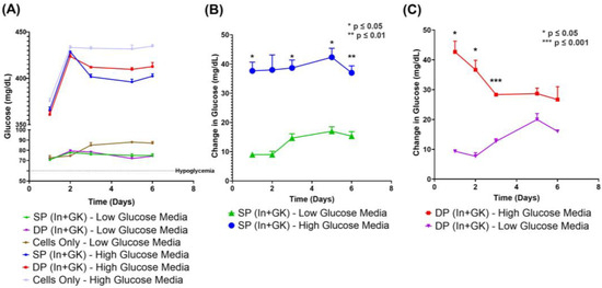 Glucokinase acts as a glucose sensor, preventing hypoglycemia (A). Change in glucose consumption based on cells in high- and low-glucose conditions when transfected with pDNA (B,C); *: p ≤ 0.05; **: p ≤ 0.01; ***: p ≤ 0.001.