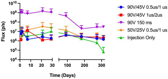 In vivo bioluminescence assessments revealed a >100-fold significant increase in luciferase protein expression over injection only in a span of three months, with sustained elevated levels of luciferase expression persisting even six months following a single treatment with the monophasic pulsing condition (Figure 7). Conversely, only the 50 V/25 V biphasic condition significantly increased expression by up to 10-fold over injection only (Figure 7).