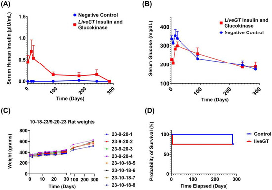 Following increases in reporter gene luciferase transfection using the monophasic pulsing regimen, the same pulsing protocol was employed with Nanoplasmid® DNA encoding both insulin and glucokinase. Analysis via human insulin ELISA demonstrated significant increases in serum human insulin levels persisting for up to 3 months (Figure 8A). Additionally, reductions in glucose levels relative to controls were noted on days 7 and 14 (Figure 8B). Normal rat growth was observed over time (Figure 8C), with all rats gaining proper weight during observation time post treatment. According to a Kaplan–Meier survival plot, liveGT delivery is safe, as survival was the same between treated and untreated animals (Figure 8D).