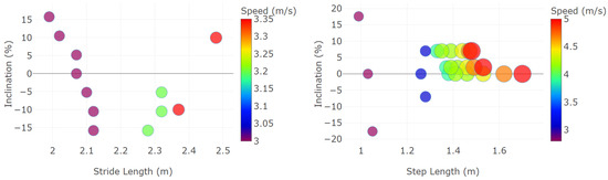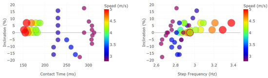 According to previous research, maximum speed results from the optimal relationship (combination) between stride length and stride frequency [14]. Similar findings were reported by Overan et al. [15], who characterized several runners based on their stride length and frequency, describing a strong relationship between both parameters. Moreover, several authors reported a curvilinear increase in stride length and cadence with running [15,16,17,18,19,20]. In the literature, available reports on this matter also described the negative curvilinear relationship of stance phase with increasing speed [15,18,21,22,23,24,25]. The phase of flight, however, was reported to grow with increasing running speed, although at high speeds, it stabilized at a constant level [15]. Compared to running at zero incline, few studies have analyzed spatiotemporal parameters at different inclinations. In the review article on the biomechanics of running on downhill and uphill runs published by Vernillo et al., only nine papers were included in the spatiotemporal analysis of running [5], which emphasizes the lack of details accessible on the topic.