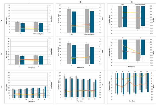- Accelerated aging to simulate long-term stability under stress. The aging process comprised three cycles of storing at 45 °C/75% relative humidity and 25 °C for 24 h. At the end of the test, the samples were visually inspected for potential phase separation, and the distributions of size and ζ-potential of the droplets in the dispersed phase were assessed with DLS, as above.