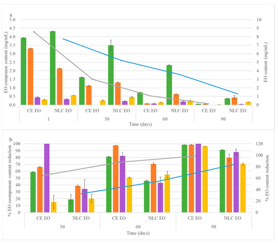 3.3. Retention of EO Content in CE EO and NLC EO During Storage at 4 °C