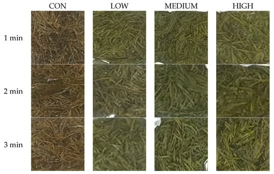 Sargassum horneri (SH) was harvested at Gijang (35.1796° N, 129.0756° E), Busan, South Korea, in April 2021. The harvested SH was prepared following a 4 (blanching temperatures: 21, 60, 70, and 80 °C) × 3 (durations: 1, 2, and 3 min) factorial design with four replications per treatment. The SH was blanched in a 9:1 ratio of tap water to SH for 1, 2, or 3 min at 21 (control, CON), 60 (low temperature, LOW), 70 (medium temperature, MEDIUM), or 80 °C (high temperature, HIGH) in a water bath (Figure 1). The temperatures of the tap water were assigned based on our preliminary study to reduce the salt content of SH (unpublished data). After the blanching process, SH was gently rinsed with fresh water twice and kept in a sieve for 5 min to drain the fresh water.
