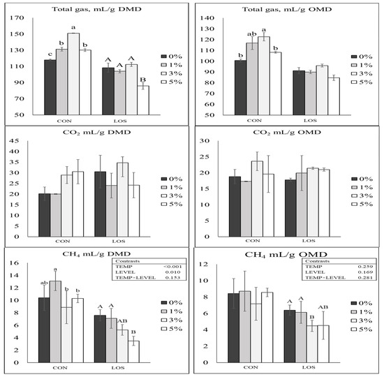 The effect of blanching temperature and supplementation level on total gas emission, CO2, and CH4 of Sargassum horneri in the rumen incubated for 48 h. CON, Sargassum horneri blanched in cool water (21 °C) for 3 min; LOS, Sargassum horneri blanched in water at 70 °C for 3 min; 0, 1, 3, and 5%, supplemented levels of Sargassum horneri. The significances of temperature, level, and temperature × level on total gas mL/g DMD are p < 0.001, p = 0.002, and p = 0.023, respectively. The significances of temperature, level, and temperature × level on total gas mL/g OMD are p < 0.001, p = 0.003, and p = 0.081, respectively. The significances of temperature, level, and temperature × level on CO2 mL/g DMD are p = 0.001, p = 0.305, and p = 0.759, respectively. The significances of temperature, level, and temperature × level on CO2 mL/g OMD are p = 0.945, p = 0.638, and p = 0.885, respectively. The significances of temperature, level, and temperature × level on CH4 mL/g DMD are p < 0.001, p = 0.010, and p = 0.153, respectively. The significances of temperature, level, and temperature × level on CH4 mL/g OMD are p = 0.259, p = 0.169, and p = 0.281, respectively. a–c Means in the same CON treatment with different superscripts differ significantly (p < 0.05). A,B Means in the same LOS treatment with different superscripts differ significantly (p < 0.05).