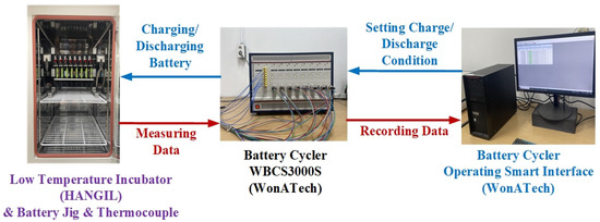 The experimental battery charging/discharging cycler system is shown in Figure 2. The WBCS3000S battery cycler and its operating software is Smart Interface software Ver. 1.8, which were manufactured by WonATech Corp. (Seoul, Republic of Korea). The charging temperatures of the battery were measured using thermocouples attached to the battery, which was fixed in a low-temperature chamber. The desired charging and discharging conditions were regulated by Smart Interface software installed on a desktop computer. The measured voltage, current, and temperature of the battery were transferred to the desktop via the battery cycler.