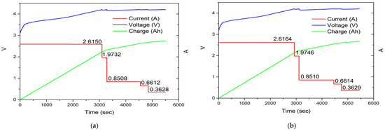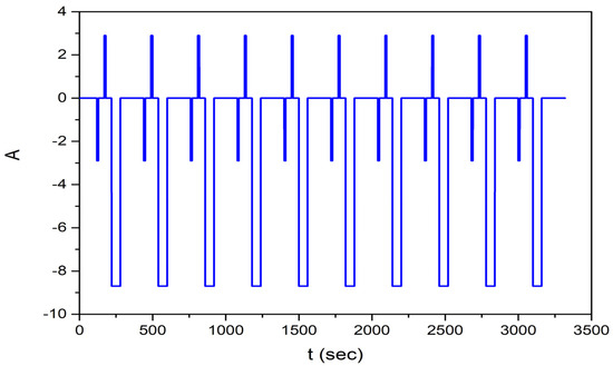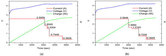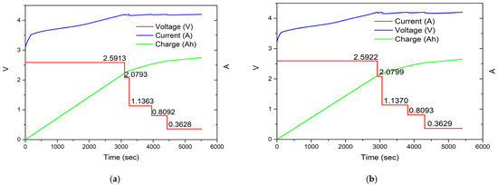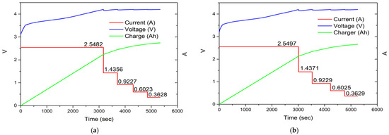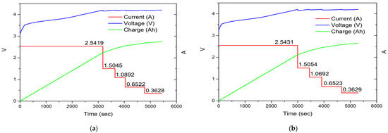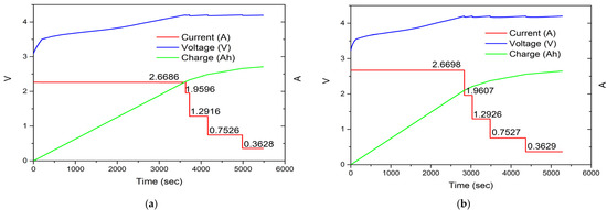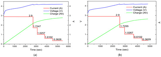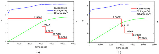 where denotes the charging current of stage. The current amplitude of the final stage was calculated to charge the battery to 100% capacity as follows: