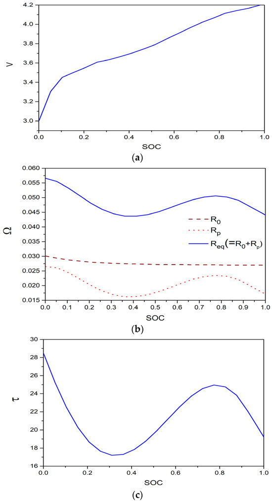 Identified characteristic curves. (a) OCV vs. SOC. (b) , and vs. SOC. (c) vs. SOC.