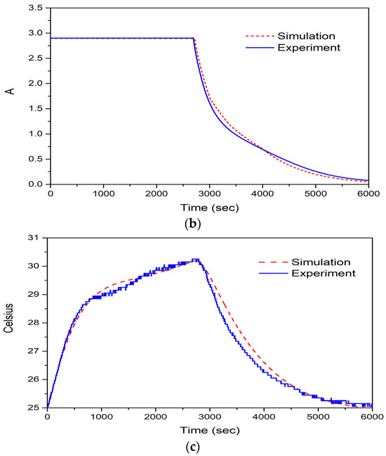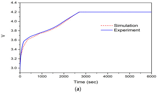 where denotes the convective heat, represents the heat transfer coefficient, indicates the cell area, and refers to the temperature increase. The charging temperature was set to . The CC-CV charging results at 1C for the Panasonic NCR18650PF LiB based on the identified parameters are shown in Figure 5. The root mean square errors (RMS) for the charging current, voltage, and temperature rise between the constructed model and the real battery were calculated as 1.3%, 2.2%, and 22%, respectively. The RMS value of the temperature rise was relatively high, but since the maximum charging temperature was more critical for the battery performance, this deviation was acceptable.