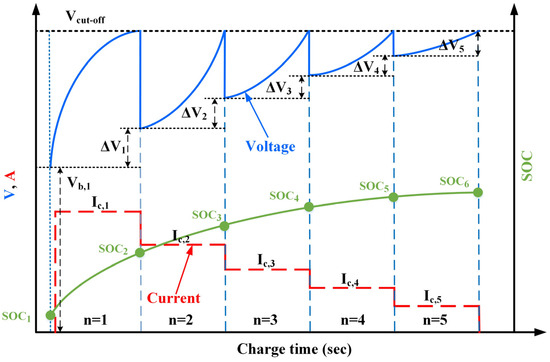 where . Figure 6 illustrates a conceptual diagram of the MSCC method, showing the typical battery charging voltage and current shapes corresponding to varying SOC. Previous work [23] demonstrated that a five-stage CC approach is efficient. Although increasing the number of current stages can reduce charging time, it also increases the complexity and implementation costs. From Figure 5, the charged battery capacity of each state is given by