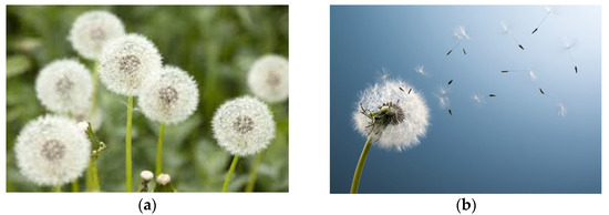 The dandelion shown in Figure 8 [42,43], an herbaceous perennial in the Asteraceae family, reaches heights of over 20 cm and is distinguished by its wind-pollinated seeds. Dandelion is a typical wind-pollinated plant. These seeds are dispersed by the wind, aided by a crown of hair that allows them to float for extended durations and travel over vast distances, often covering tens of kilometers under optimal conditions. The seeds fall slowly due to two symmetrical vortices created overhead and stabilized by the crown’s porous structure. The seeds’ travel behavior changes based on wind velocity and weather conditions, unfolding in three main stages. In the rising stage, a vortex appears above the seeds, significantly increasing the drag under sunny and windy conditions, while rain prevents vortex formation. During the descending phase, the seeds gradually descend after reaching a certain height. Finally, in the landing stage, the seeds disperse randomly, depending on local wind and weather conditions, where they may establish new plants.