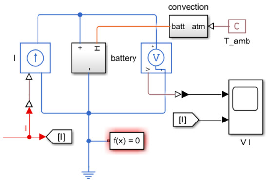 The parameter identification results are presented in Figure 5. The simulation model for the Thevenin ECM was constructed using the Simscape and Simulink packages of the MATLAB software R2024b. The thermal model is constructed as follows: