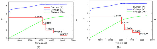 In the MSCC charging method illustrated in Figure 7, the current at each stage is selected constantly like the CC mode of the CC-CV technique: in the CC stage, the voltage increases to the cut-off voltage, where once the voltage reaches the cut-off, the current decreases exponentially, like the current behavior in the CV mode, with the voltage drop determined by the following equation; in the next stage, the voltage increases again according to the selected CC value. The charge current rate at each stage is constrained to be lower than the previous stages for better charging efficiency, which is defined as the ratio of the discharge capacity to the capacity charged in the battery during the charging process.