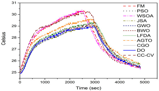 The simulation results are presented in terms of four charging performance evaluation indicators (CPEIs): the best FC (FCbest), charge time (CT), maximum charge temperature (MCT), and EL. The results are summarized in Table 5 and Table 6. According to the CPEI results in Table 5, the FC value was the highest for the CC-CV method and the lowest for the DO method. Regarding CT, the FM produced the smallest value; however, due to FM’s inability to manage temperature increases, its CT value was relatively high. Although the CT value for DO was higher than that of FM, it remained the smallest compared to the other MOAs. Furthermore, the MCT value for DO was the lowest, and the EL value for DO was also the lowest, indicating that it was the most efficient method. Selected MSCC values are presented in Table 6.