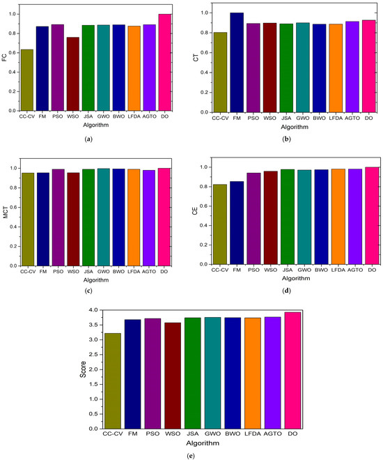 Bar charts of the performance indicators. (a) FC. (b) CT. (c) MCT. (d) EL. (e) Total score.