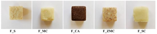 Photos of the original scrub bars with exfoliant: sucrose (F_S), microcrystalline cellulose (F_MC), Coffea arabica seed powder (F_CA), Zea mays (corn) cob granules (F_ZMC), and sodium chloride (F_SC).