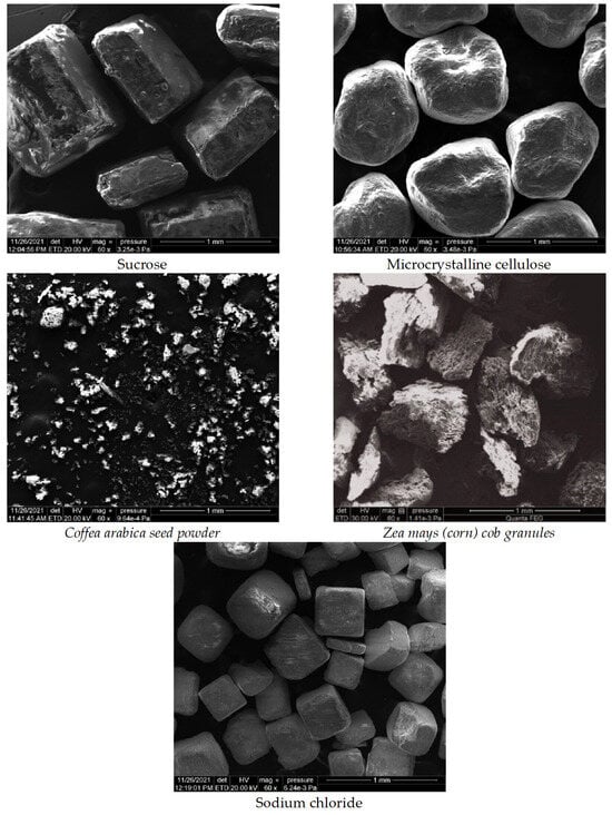 Sucrose particles exhibited a highly regular shape, appearing as cuboids with precisely defined edges. Their size typically ranged from 600 to 1100 μm. Similar to sucrose, the morphology of microcrystalline cellulose was characterized by a very high degree of regularity, but its particles were more spherical in shape, with rounded edges. Typically, their dimensions fell within the range of 700 to 1050 μm. Coffea arabica seed powder stood out due to its substantially smaller particle size, typically ranging from 30 to 100 μm. The particles had an irregular shape, with no visible sharp edges. High amorphousness was also shown for Zea mays (corn) cob cranules. The photograph depicts a mixture of spherical particles and oblong particles with distinctly sharper edges. These particles also exhibited the greatest size variations, between 600 and 1600 μm. The greatest regularity of shape was observed in sodium chloride crystals, which were nearly cubic and had sharply defined edges. These particles showed only slight variations in size, typically falling within the range of 350 to 450 μm. Based on the criteria for classifying particle shapes proposed by Russell and Taylor [29] and Pettijohn [30], sucrose and sodium chloride can be categorized as angular-shaped, microcrystalline cellulose as well-rounded, and Zea mays (corn) cob granules and Coffea arabica seed powder as subrounded particles. The authors of research papers [31,32] state that abrasives should be evaluated based on three factors: hardness, dimensions, and particle shape. In addition, they found that ground fruit seeds provide more abrasive exfoliation due to their coarse particles, while more spherical and smooth particles provide smoother exfoliation. The authors also warn of the negative effects of using larger, harder, and irregularly shaped abrasives that cause a rough feeling on the skin, which can cause irritation and sometimes injury.