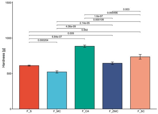 Hardness of scrub bars with exfoliant: sucrose (F_S), microcrystalline cellulose (F_MC), Coffea arabica seed powder (F_CA), Zea mays (corn) cob granules (F_ZMC), and sodium chloride (F_SC).