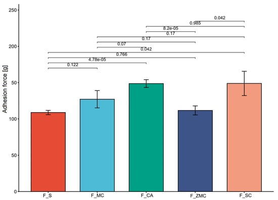 Adhesion force of scrub bars with exfoliant: sucrose (F_S), microcrystalline cellulose (F_MC), Coffea arabica seed powder (F_CA), Zea mays (corn) cob granules (F_ZMC), and sodium chloride (F_SC).