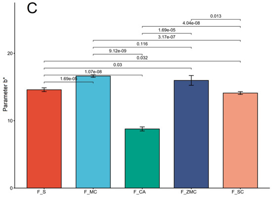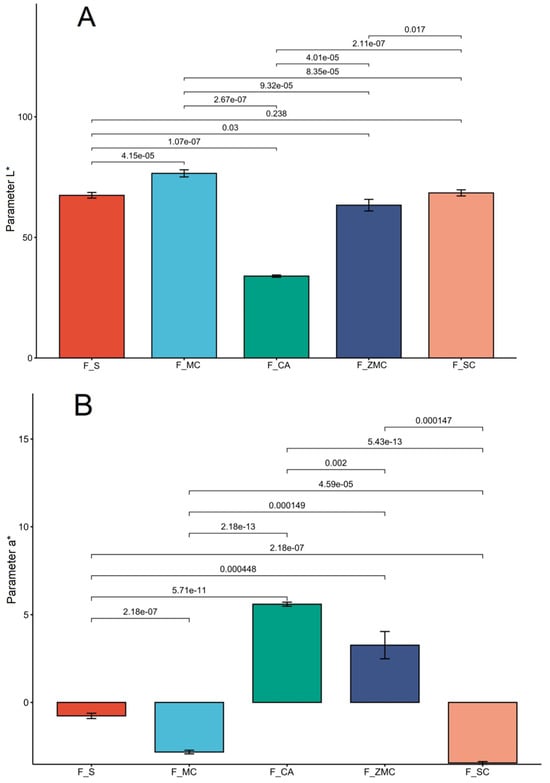 Results of colorimetric measurements for scrub bars with exfoliant: sucrose (F_S), microcrystalline cellulose (F_MC), Coffea arabica seed powder (F_CA), Zea mays (corn) cob granules (F_ZMC), and sodium chloride (F_SC). (A) Parameter L*, (B) Parameter a*, (C) Parameter b*.