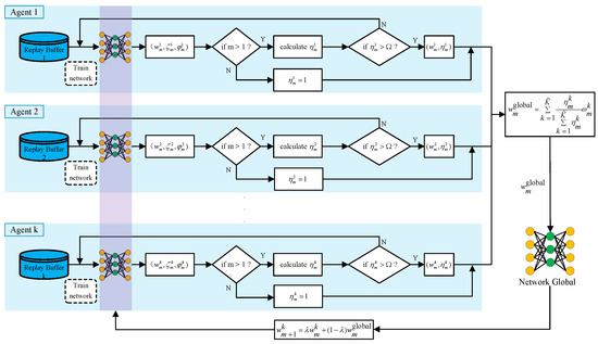 Therefore, model aggregation is essential in FL for agents to share experience, and determining how to achieve a better model is crucial. During the model training, federated models can be biased towards different agents. In [32], an agnostic FL approach is introduced, where a centralized model is optimized for any target distribution formed by a mixture of the client distributions. A reputation-supported aggregation method [33] is presented to measure the user’s aggregation weight based on reputation scores. Majcherczyk et al. [34] put forward a data-driven mechanism to synchronize the learning process, in which a robot can contribute the model updates when enough data are collected. The state of the art also shows the possibility of combining RL with FL in data management [35,36,37].