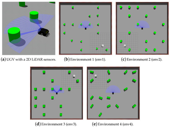 Our experiments involve the design of six distinct scenarios, which are categorized as either familiar or unfamiliar. The familiar group comprises four scenarios, as presented in Figure 4. During the training period, UGVs are trained in these environments before evaluating the performance of mapless navigation. Therefore, UGVs are familiar with the scenarios in this group. Conversely, the unfamiliar group (Figure 5a,b) consists of environmental configurations that the UGVs have never encountered before. This enables the evaluation of the knowledge transfer and generalization capabilities in unknown and unfamiliar environments. As illustrated in Figure 4, each UGV will be initialized at the center of each scenario during the training period, with a randomly assigned target location at one of the corners. The obstacle locations are also randomly generated for each run. Specifically, the positions of the obstacles are uniformly distributed across the map, and their orientations are randomly sampled from the interval to introduce variability in obstacle configurations. The target location is represented by the white square, the green objects depict the obstacles, and the blue lines indicate the laser beams of each robot.