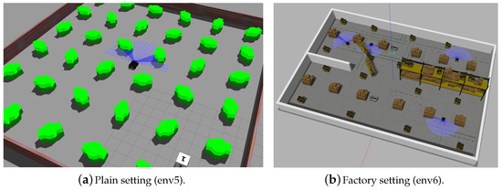 Here, we will further investigate the generalization ability and the performance of trained models in unfamiliar environments, in which the UGVs have never encountered these types of obstacles during training runs. Figure 5a shows a new dense setting (env5), where the obstacles have different shapes and sizes compared to env1 to env4, while Figure 5b presents another unfamiliar factory setting (env6), where UGVs may encounter more complex obstacles, such as shelves with slender legs.