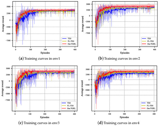 In order to evaluate the training performance, we record the average rewards per round for both of them across env1 to env4. Figure 6 presents the training curves of three approaches, where the x-axis denotes the number of rounds and the y-axis denotes the average reward. The solid line and shaded regions depict the mean and standard deviation, respectively, derived from ten independent runs. In terms of the convergence of the average reward, FL-TD3 exhibits similar performance to TD3 in env1, env2, and env3 but outperforms TD3 in env4. Comparatively, our FGRL demonstrates the best performance across all four environments. As for the convergence speed, TD3 achieves convergence in approximately 150 episodes for env1 and 200 episodes for env2, env3, and env4. Conversely, both FL-TD3 and our FGRL converge in approximately 100 episodes.