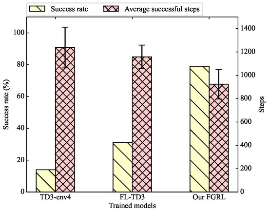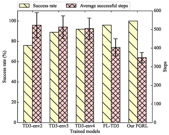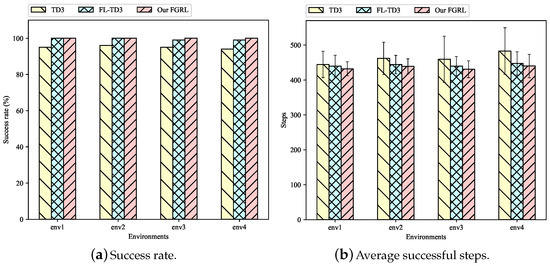 During the training and testing experiments, it should be noted that the shape and size of the obstacles gradually become more and more complex from env1 to env5. As shown in Figure 8, when the trained models are applied to resolve unfamiliar scenarios, the success rate of TD3 and FL-TD3 tends to decline. The experimental results show that although the trained models of TD3 and FL-TD3 can perform well in the training scenarios (i.e., env1 to env4), they are still prone to collide with unfamiliar obstacles in env5.