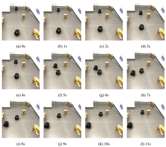 Both robots begin moving from their starting positions. After 5 s, they encounter the obstacles and begin to avoid them. By 7 s, both robots successfully navigate around the obstacles and head toward their target locations. By 11 s, both robots reach their respective targets.