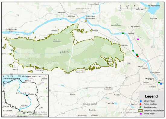 The migration of people from rural to urban and industrial areas contributed to an increase in urbanization [1,2]. Numerous city studies show positive and negative socioeconomic processes occur here [3,4]. In communist countries such as Poland, industrial districts of cities, such as Nowa Huta in Cracow, were developed rapidly. Unfortunately, at that time, ecological aspects were often overlooked, which harmed the natural environment [5]. After joining the European Union, Poland implemented the wastewater and water framework directives [6,7]. Poland’s environmental protection required a reduction in the amount of nutrients from municipal sources discharged into water and soil. Poland is a top country contributing to nutrient pollution because the Baltic Sea provides 25% of the total nitrogen and 32% of the total phosphorus load [8]. The treaty obligations also indicated that all agglomerations with a population equivalent greater than 2000 people must be equipped with collective sewage systems and sewage treatment plants. Water pollution may be caused by planned or accidental release of various pollutants and chemicals [9]. Sewage discharge can cause multiple environmental damages due to changes in water resources and reductions in biodiversity. Untreated sewage affects water quality in water bodies and human health [10]. A total of 55% of used freshwater resources are discharged as municipal and industrial sewage. One of the sustainable development goals is to ensure that people have access to clean drinking water and emphasize the sustainable management of sanitation [11,12]. SDG 6.3 states, “By 2030, improve water quality by reducing pollution, eliminating the storage and minimizing the release of hazardous chemicals and materials, halving the share of untreated wastewater and significantly increasing recycling and safe reuse globally”. Due to the inflow of pollutants, the water cannot be used for drinking and irrigation purposes. The problem of untreated sewage discharged into water bodies occurs in Antarctica, USA, Serbia [13,14,15]. One of the most common point water pollutants is leaky septic tanks, which are only used for periodic accumulation of sewage. Emergency discharges of pollutants from large sewage treatment plants in cities are much less common.