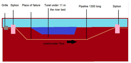The amount of untreated sewage discharged ranged from 2 to 3 m3·s−1. The rupture of the municipal sewage pipeline occurred at a depth of 11 m below the river bottom on its left bank (Figure 2). The pipeline runs under the Northern Bridge in Warsaw, located at 513.9 km of the river path. During the sewage system failure, the discharge of the Vistula River ranged from 232 to 260 m3·s−1.